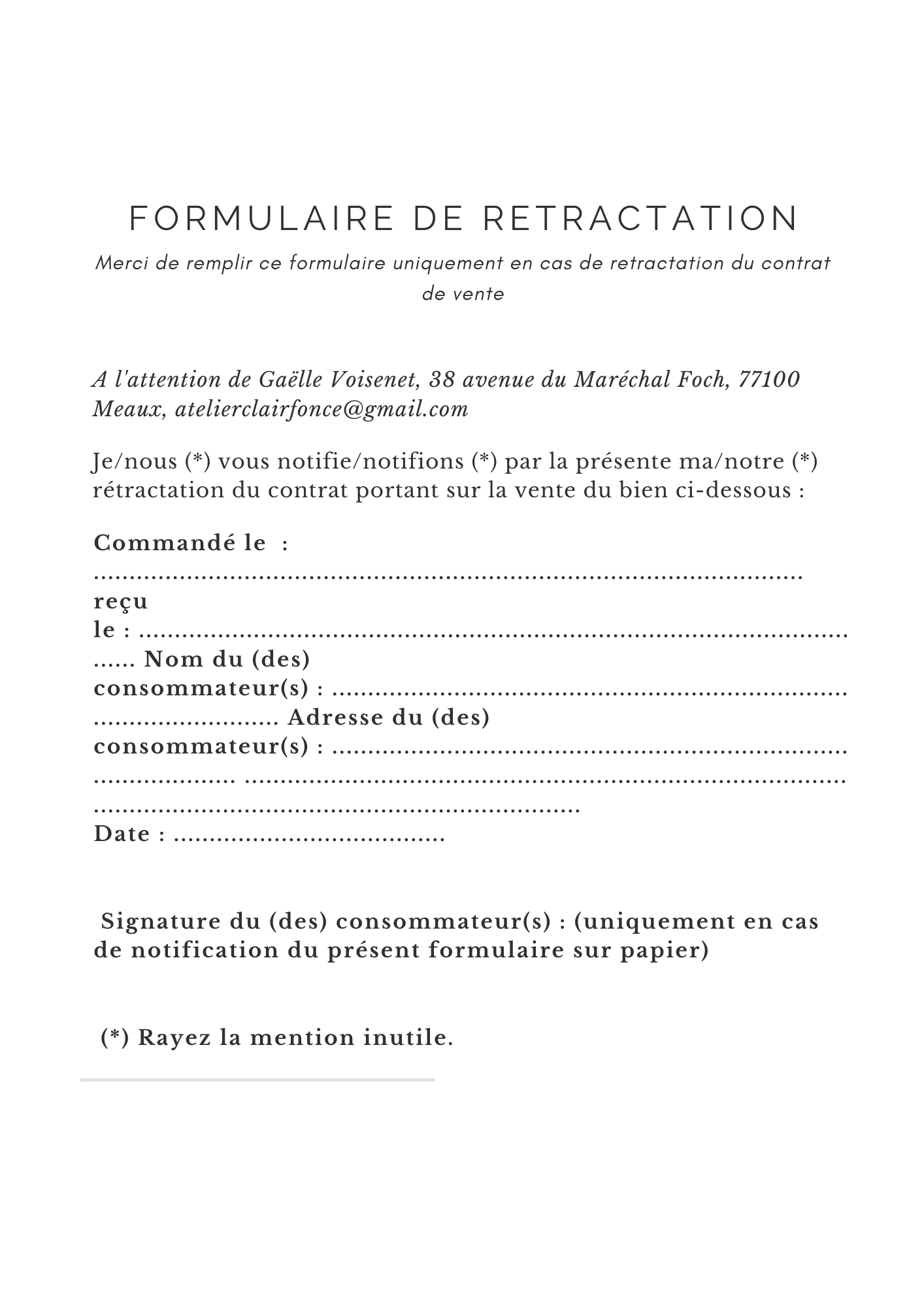 Envoyez un email nous informant que vous exercez votre droit de rétraction à l’adresse suivante : atelierclairfonce@gmail.com dans les 14 jours suivant la réception de votre commande. Objet du mail : RETRACTATION + n° de commande ainsi que le formulaire de rétractation ci-dessous dument dument rempli.
