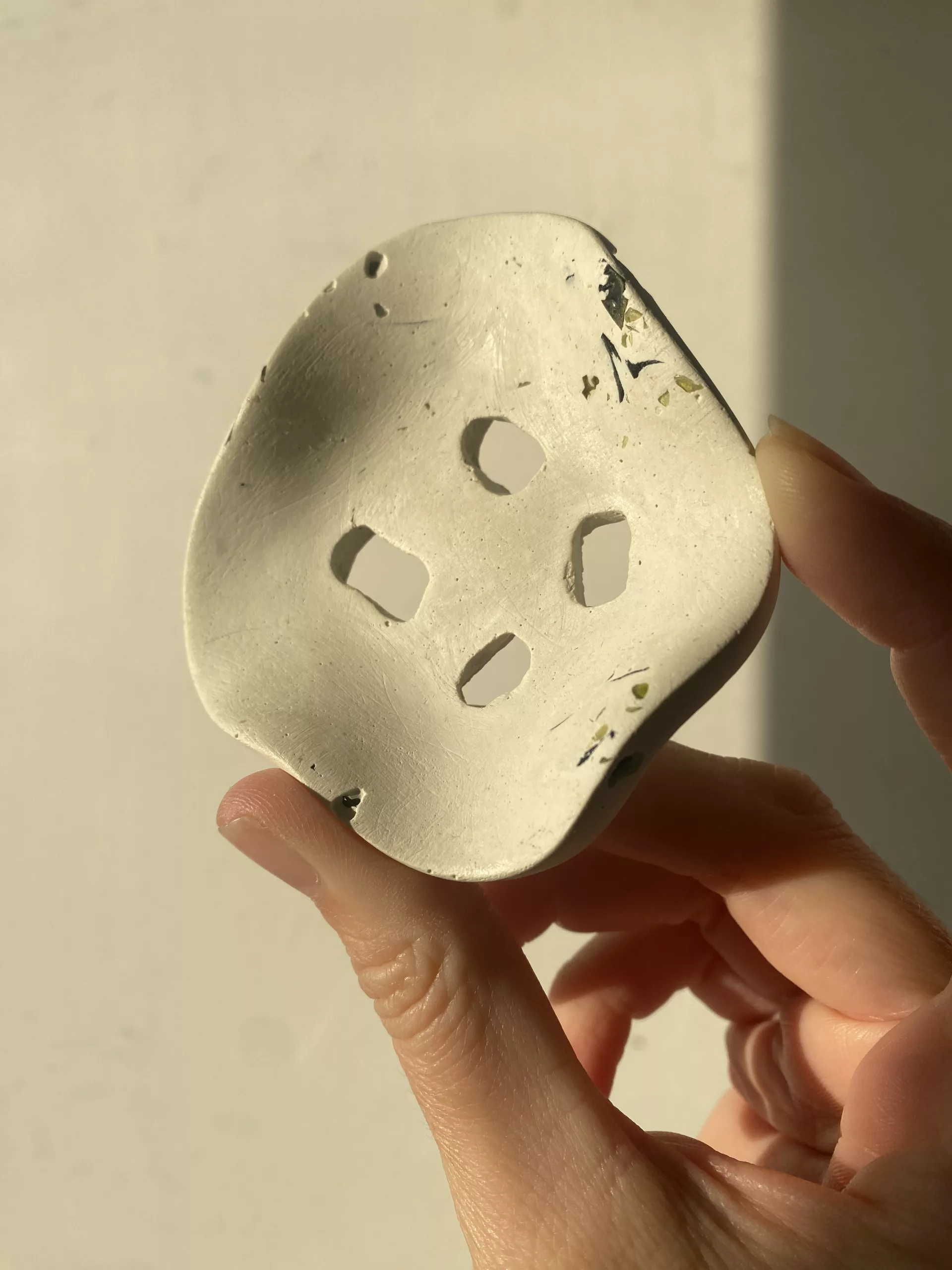 Chaque pièce est fabriquée à la main en béton, avec de légers éclats de verre de couleur qui rendent chaque exemplaire unique. Les perforations permettent d’y insérer des tiges fines ou des petites boutures, à poser sur un récipient d’eau ou à utiliser comme élément décoratif.