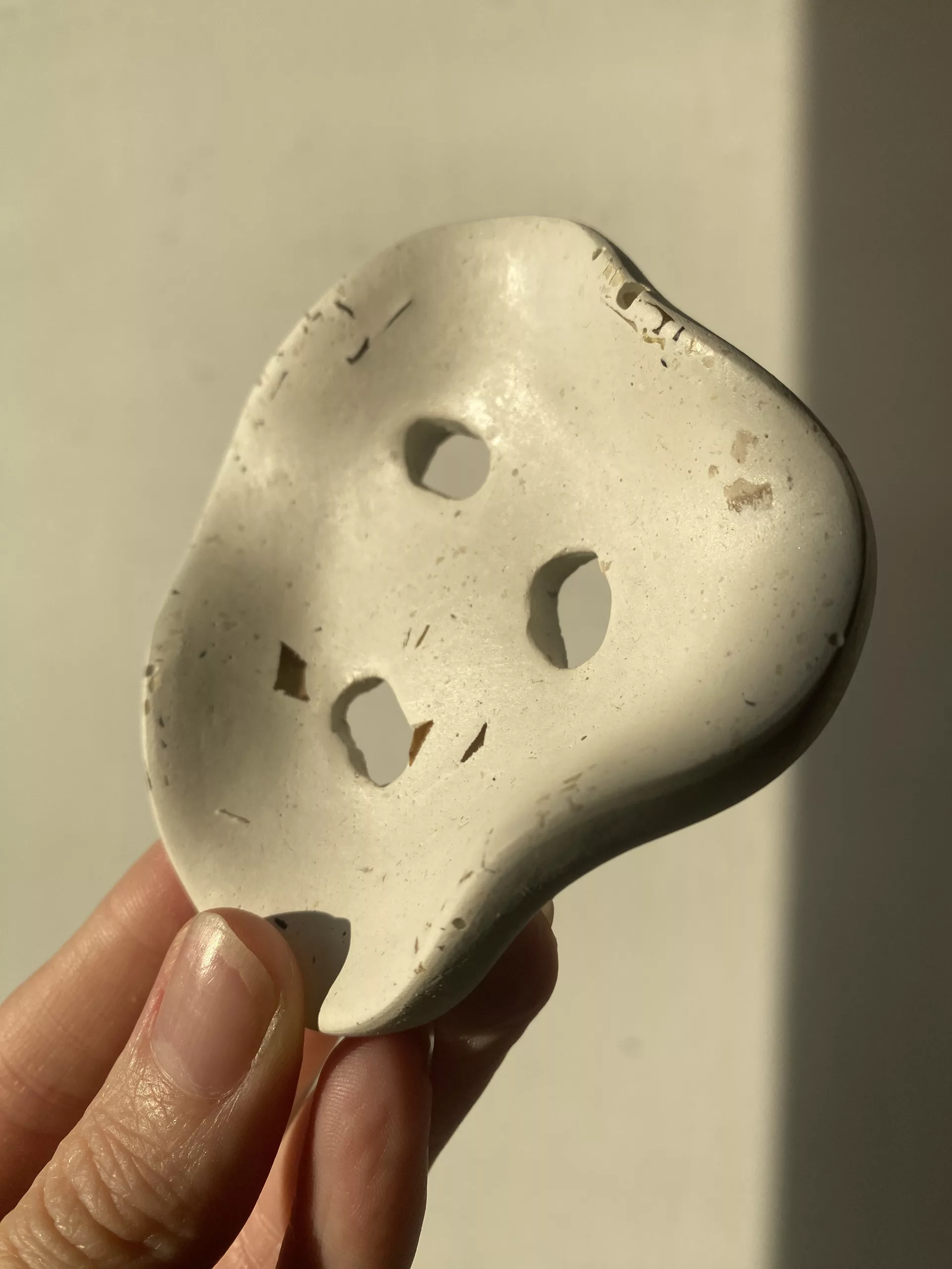 Chaque pièce est fabriquée à la main en béton, avec de légers éclats de verre de couleur qui rendent chaque exemplaire unique. Les perforations permettent d’y insérer des tiges fines ou des petites boutures, à poser sur un récipient d’eau ou à utiliser comme élément décoratif.