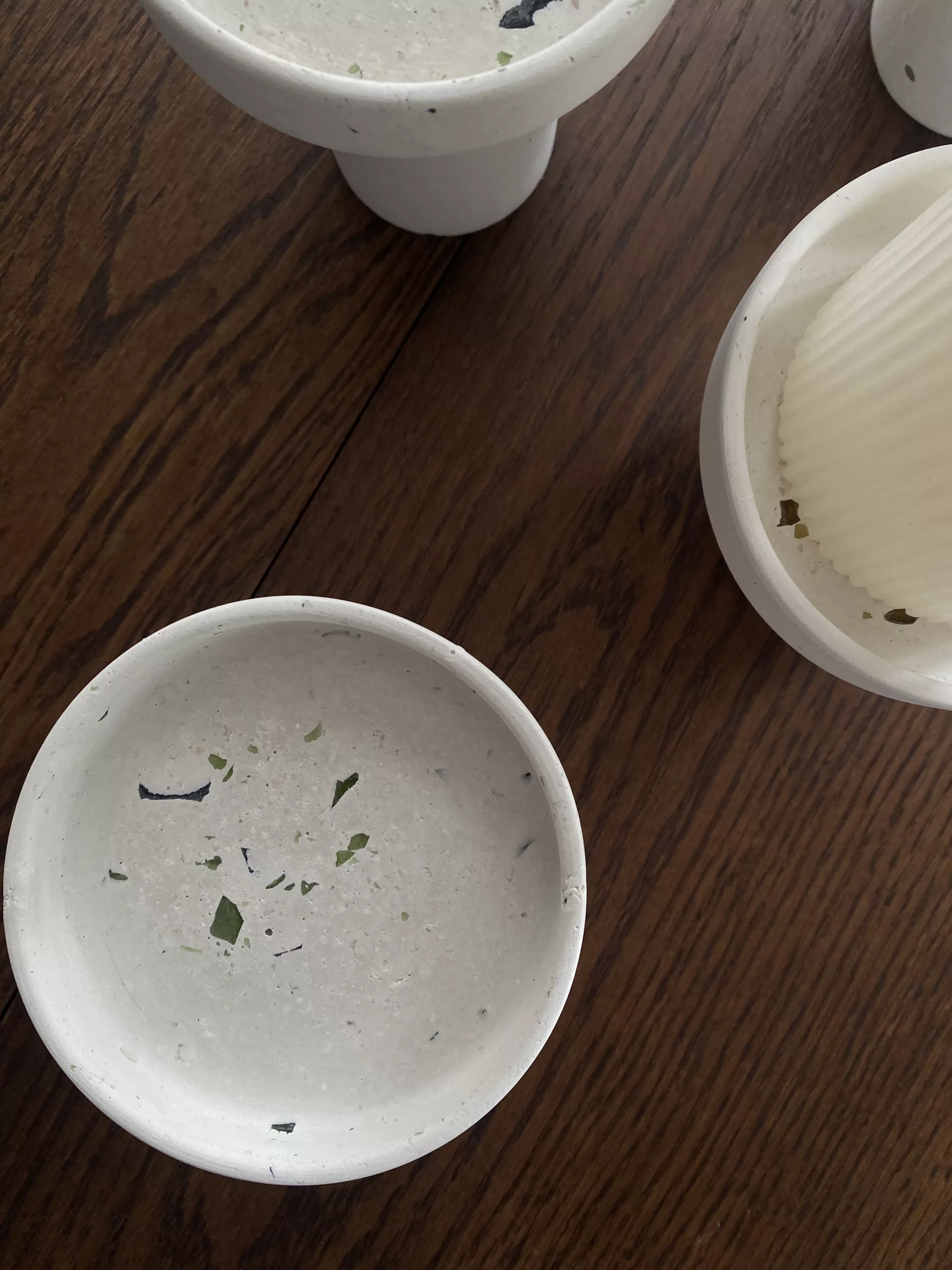 Chaque pièce est coulée, poncée et finie à la main, révélant de légères variations naturelles dans la matière qui rendent chaque exemplaire unique.