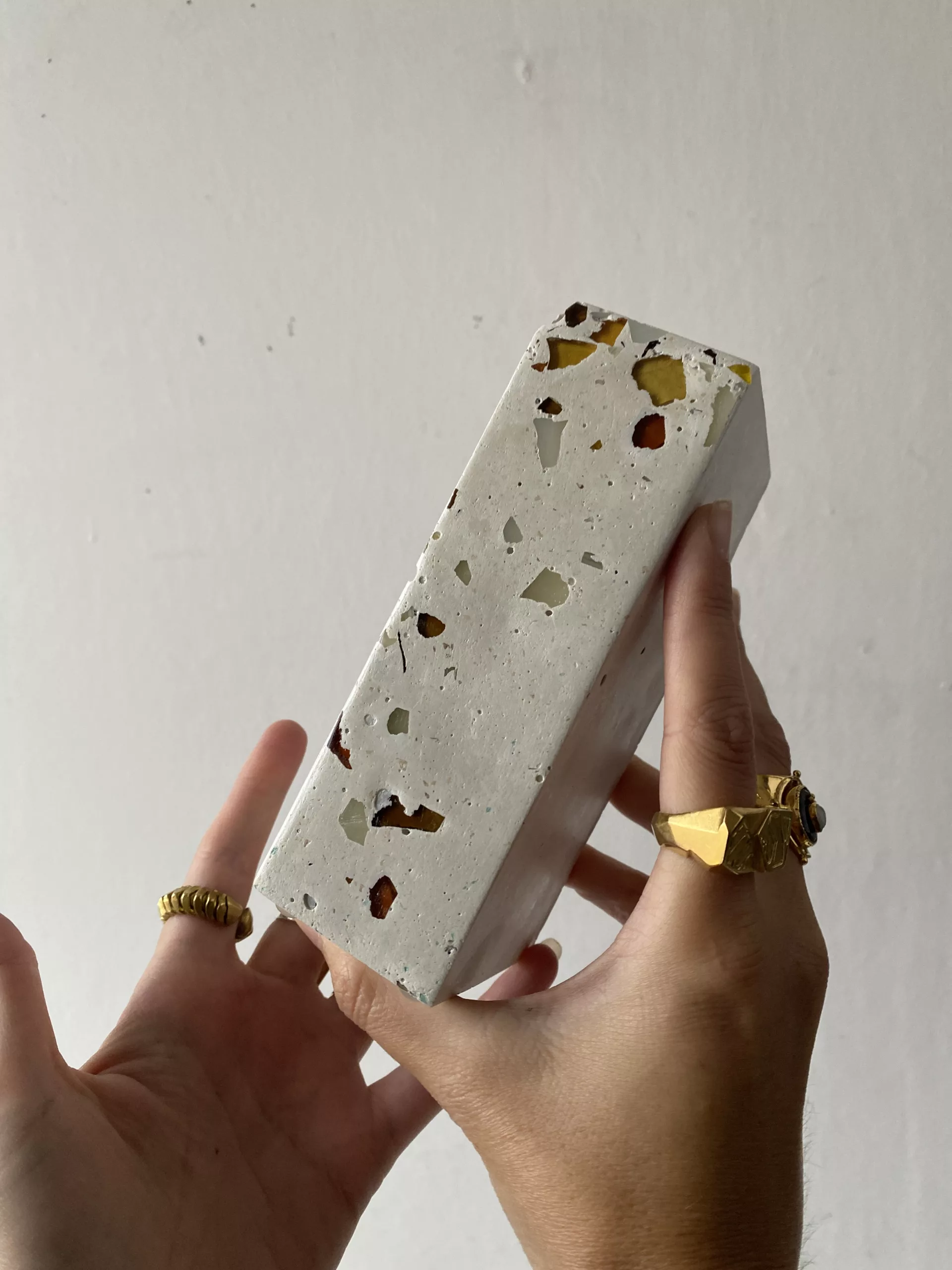 Cet objet est une pièce originale d’Atelier Clairfoncé, fusionnant l’audace du béton avec l’élégance scintillante des éclats de verre.