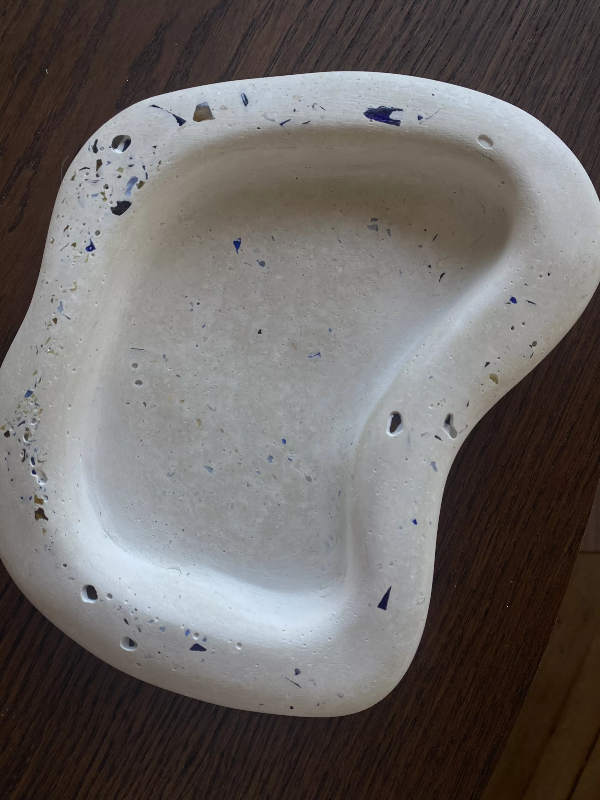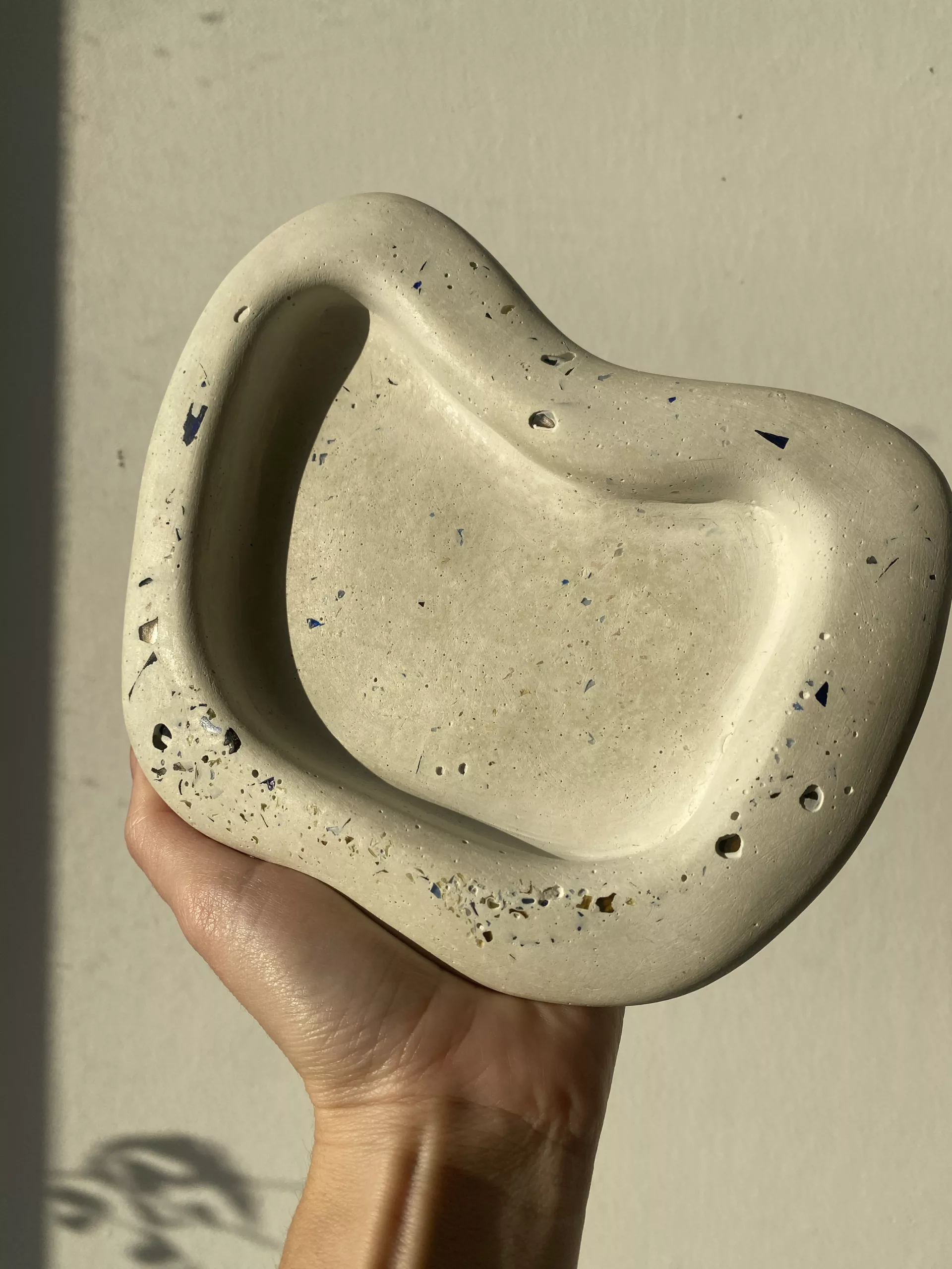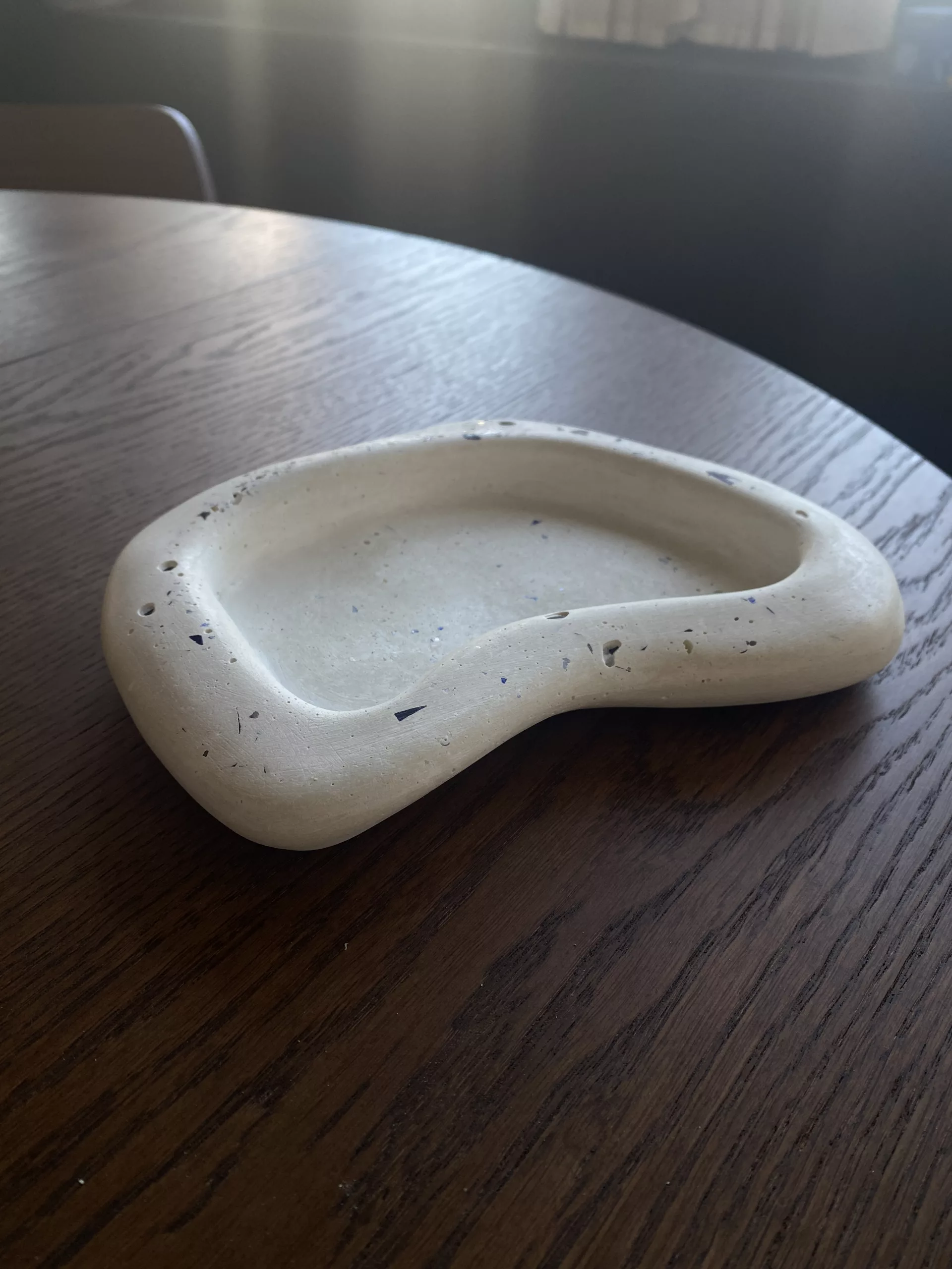 Ce vide-poche en béton à la forme organique et irrégulière, évoque les courbes naturelles de la pierre ou du bois flotté. Sa texture brute met en valeur la matière minérale, tandis que sa silhouette unique apporte une touche artistique et contemporaine à tout espace.